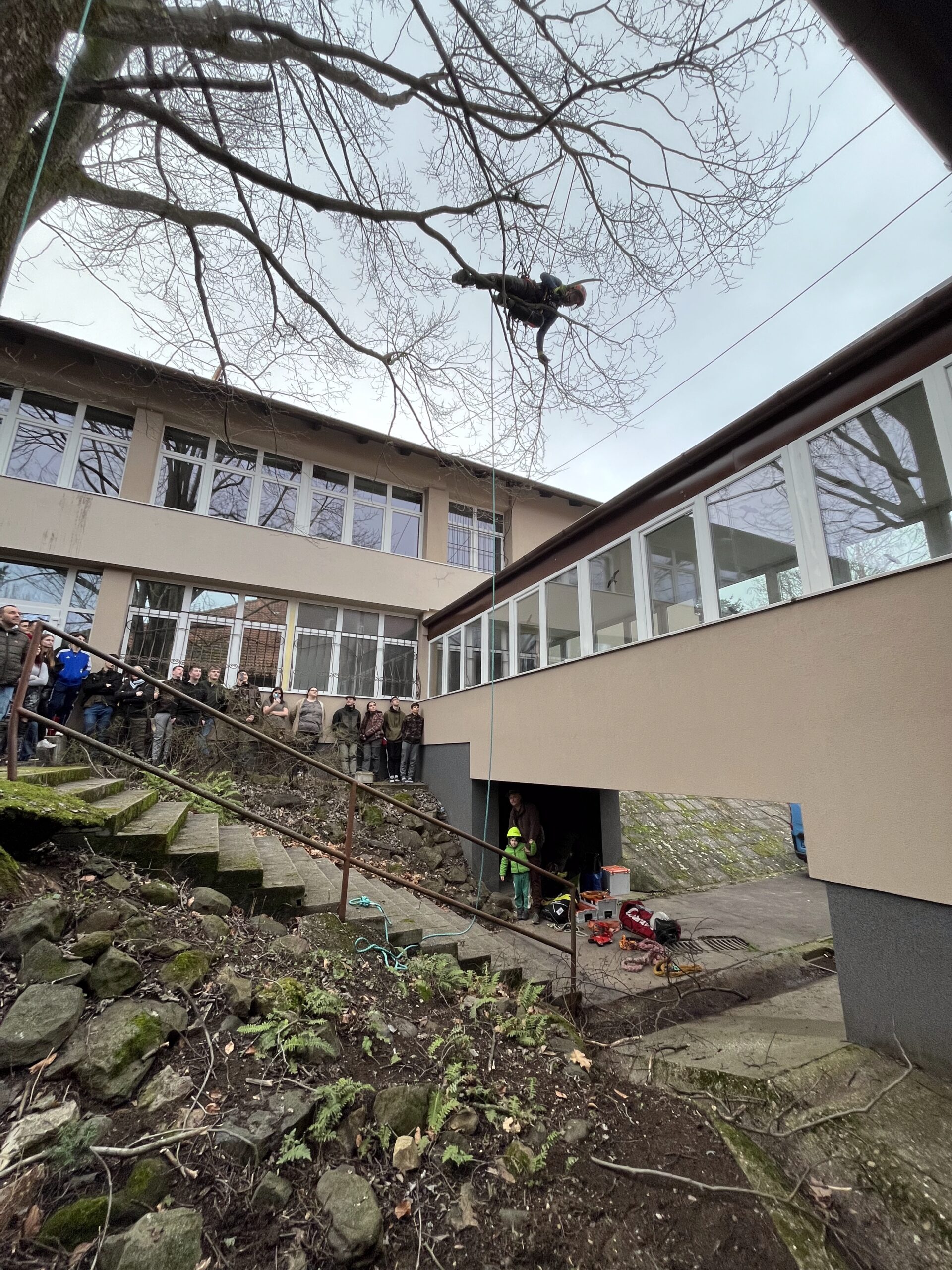 A bemutató második részében a résztvevők egy gyakorlati szakmai bemutatón vehettek részt, ahol egyesületünk tagjai kötéltechnikai faápolást hajtottak végre egy Hegyi Szil fán. A bemutató részeként akusztikus tomográf használatával vizsgáltuk a fát és ezen keresztül bemutattuk a favizsgáló szakma mindennapjait is.